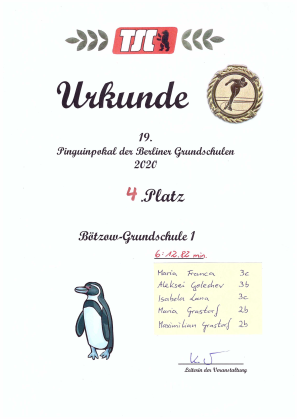 Im Staffelwettkampf der 1. bis 3. Klassen traten neun Kinder, aufgeteilt in zwei Mannschaften, gegen zehn Teams anderer Schulen an. Jede Mannschaft lief 6 Runden und bezwang das glatte Eis auf schnellen Kufen. Die gelaufenen Zeiten reichten am Ende für einen sehr guten 4.Platz (Maria 3c, Aleksei 3b, Isabela 3c, Maria 2b, Maximilian 2b) und für die zweite, noch sehr junge Mannschaft (Sophia 3a, Justus 3a, Julia 2a, Helena 1a), für einen guten 10.Platz.
